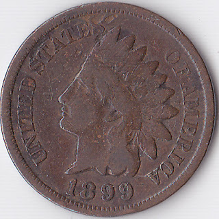 I actually got all of these pennies from a full box plus another forty dollars worth of pennies I picked up at work and the bank this week. I found the 1899 Indian head penny in the first roll I took out of a twenty-five dollar bank box. I was so excited to find it not only because it's the most valuable penny I have found but also because I was sure that box would end up having more Indian heads in it or at least a lot of wheat pennies. Unfortunately the box turned out to have only three or four wheat pennies in it and would have been the worst bank box ever if it wouldn't have been for the very first find. I have not been able to keep up on my blog posts for penny hunting because I have been concentrating on silver but I've kept everything I've found to make this one post. Below is a scan of the 1899 Indian head penny. As you can see it's in pretty good shape for a coin found in circulation.